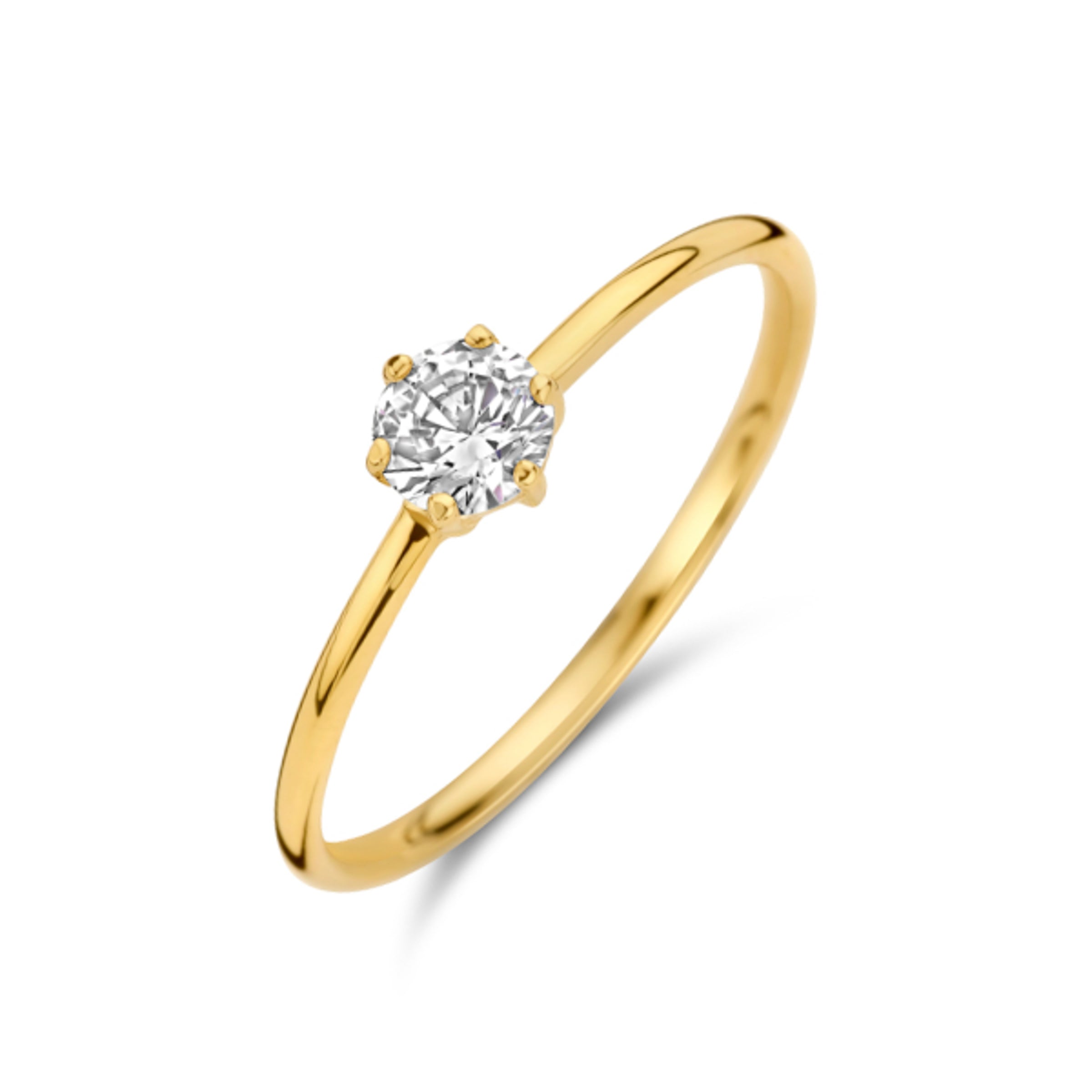 Solitär Zirkonia Ring aus 585er / 14 Karat Gelbgold. Ø Zirkonia ca. 4,0 mm. 4 Stotzen Fassung.